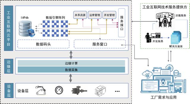鑒于以上分析,我們提出一種面向服務的工業(yè)互聯(lián)網(wǎng)的架構設計,如圖4所示。其中,工業(yè)互聯(lián)網(wǎng)的核心部分是云平臺,除了數(shù)據(jù)庫和數(shù)據(jù)引擎陣列外,需要部署共享資源、運維管理和開發(fā)管理三個基本服務模塊。工廠設備的數(shù)據(jù)經(jīng)過邊緣層后送入云平臺的數(shù)據(jù)碼頭進行緩存處理。云平臺的服務窗口用于工廠管理和生產(chǎn)各項應用的響應,即應用的可視化窗口。作為工業(yè)互聯(lián)網(wǎng)的第三方,技術服務提供方的主要任務包括與企業(yè)用戶連接,處理企業(yè)的應用需求,調(diào)用解決方案庫,提供應用開發(fā)服務。另外通過云平臺的服務接口,獲取工業(yè)互聯(lián)網(wǎng)運行狀態(tài)信息,提供運維管理,確保工業(yè)互聯(lián)網(wǎng)與企業(yè)生產(chǎn)管理過程保持同步。