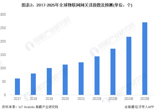 據(jù) IoT Analytic 數(shù)據(jù)顯示,截至 2021 年末全球物聯(lián)網(wǎng)連接數(shù)為 122 億,同比增速接近 8 個(gè)百分點(diǎn)。同時(shí),根據(jù) IoT Analytic 的預(yù)測(cè),預(yù)計(jì)到 2025 年,全球物聯(lián)網(wǎng)網(wǎng)關(guān)連接數(shù)將達(dá)到 270 億左右。