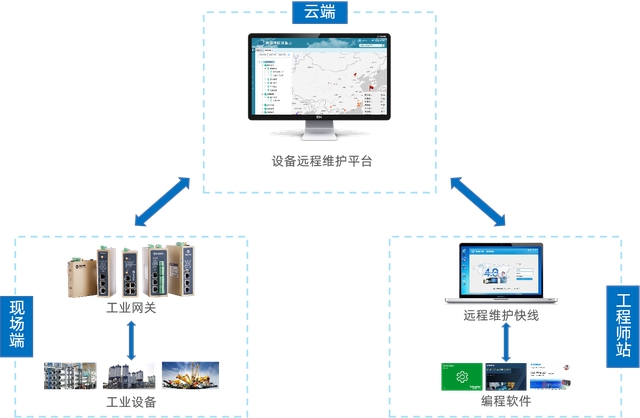 首先通過(guò)物聯(lián)網(wǎng)網(wǎng)關(guān)實(shí)現(xiàn)現(xiàn)場(chǎng)設(shè)備的聯(lián)網(wǎng),這些網(wǎng)關(guān)設(shè)備將會(huì)全天候24小時(shí)采集工業(yè)設(shè)備的數(shù)據(jù),這些經(jīng)過(guò)過(guò)濾計(jì)算后再上傳到云平臺(tái)上,實(shí)現(xiàn)設(shè)備的遠(yuǎn)程數(shù)據(jù)監(jiān)控與控制。通過(guò)設(shè)備IP地址定位臨時(shí)開(kāi)通VPN加密維護(hù)通道,讓工程師可以遠(yuǎn)程上下載程序,對(duì)其進(jìn)行維護(hù)和更新。