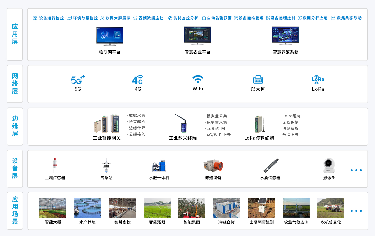 物通博聯(lián)構(gòu)建了 “終端感知 - 邊緣傳輸 - 云端中樞 - 應(yīng)用賦能” 全鏈路智慧農(nóng)牧技術(shù)架構(gòu):以工業(yè)智能網(wǎng)關(guān)、工業(yè)數(shù)字終端為核心邊緣接入層設(shè)備,實(shí)現(xiàn)對農(nóng)機(jī)作業(yè)設(shè)備(如播種機(jī)、收割機(jī)、水肥一體機(jī)等)、養(yǎng)殖環(huán)控設(shè)備(如飼喂機(jī)、通風(fēng)系統(tǒng)等)、環(huán)境監(jiān)測傳感器(如溫濕度、氨氣傳感器、光照傳感器等)等多類型終端設(shè)備的標(biāo)準(zhǔn)化數(shù)據(jù)采集與協(xié)議解析;通過穩(wěn)定的邊緣計(jì)算與網(wǎng)絡(luò)傳輸能力,將設(shè)備運(yùn)行數(shù)據(jù)、環(huán)境參數(shù)數(shù)據(jù)實(shí)時(shí)上傳至物聯(lián)網(wǎng)云平臺;在云端中樞層,依托采集的數(shù)據(jù)構(gòu)建農(nóng)牧生產(chǎn)全場景數(shù)字化看板,進(jìn)而實(shí)現(xiàn)對終端設(shè)備的遠(yuǎn)程狀態(tài)管理、異常工況自動故障報(bào)警、設(shè)備啟停遠(yuǎn)程控制及運(yùn)行參數(shù)精準(zhǔn)遠(yuǎn)程調(diào)優(yōu),最終為農(nóng)牧行業(yè)提供從設(shè)備聯(lián)網(wǎng)到智能運(yùn)營的一體化智慧解決方案,助力傳統(tǒng)農(nóng)牧向數(shù)字化、智能化轉(zhuǎn)型。