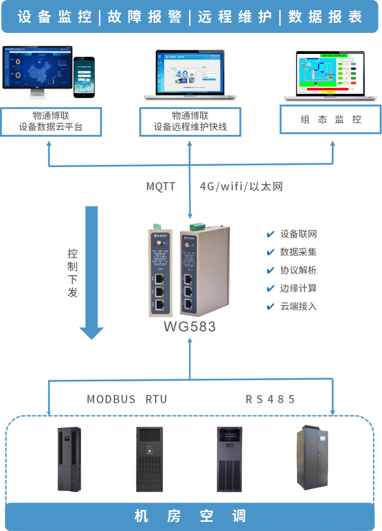 物通博聯(lián)推出的機房空調(diào)數(shù)據(jù)采集方案,是基于物通博聯(lián)工業(yè)智能網(wǎng)關(guān)WG583和物通博聯(lián)IOT云平臺,實現(xiàn)機房空調(diào)數(shù)據(jù)采集、云端組態(tài)、故障報警和遠(yuǎn)程控制,并在微信小程序進行管理和查看,有效提升設(shè)備管理效率。