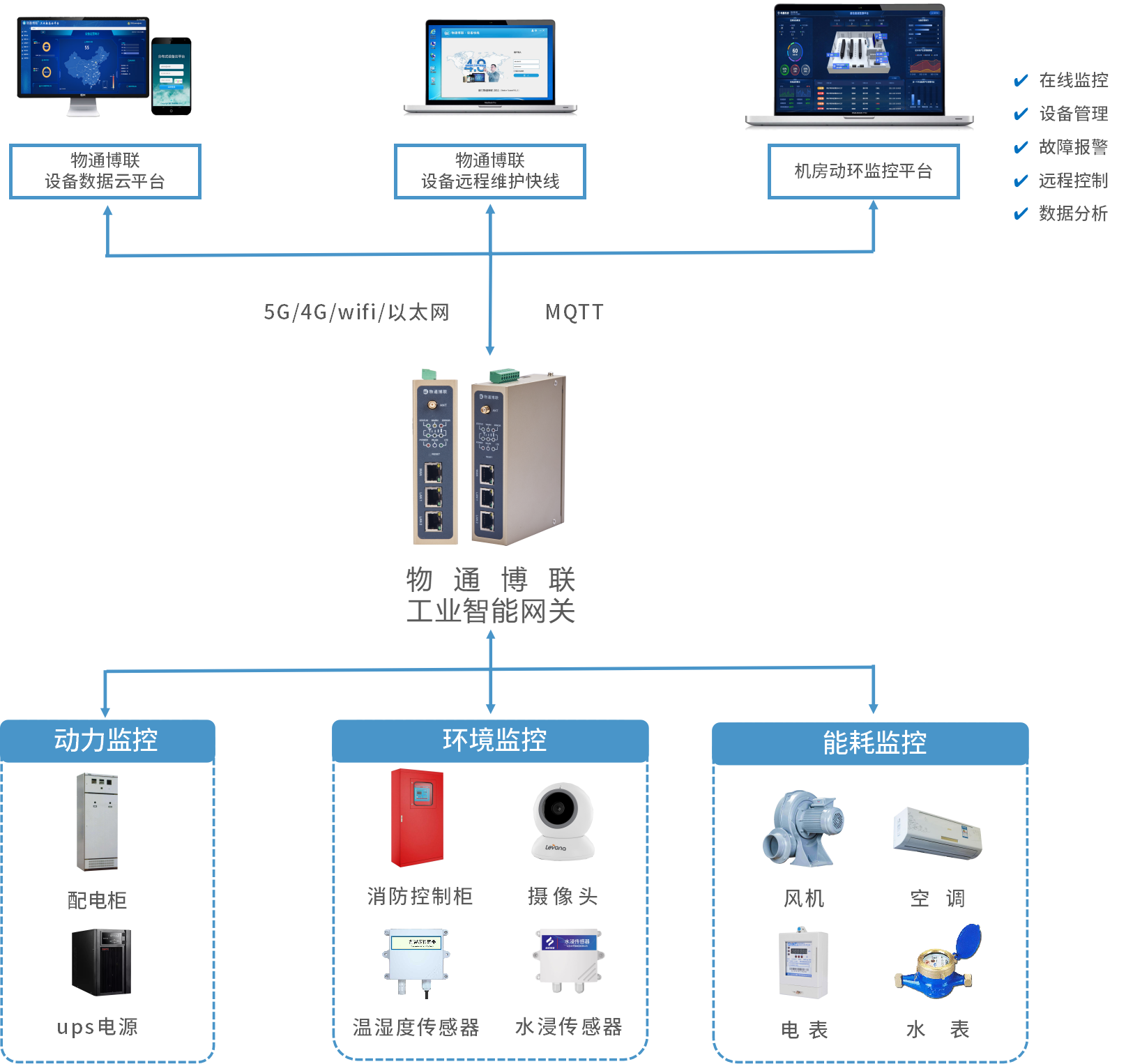 物通博聯(lián)推出的機(jī)房動(dòng)環(huán)在線監(jiān)測(cè)系統(tǒng)由工業(yè)智能網(wǎng)關(guān)和物聯(lián)網(wǎng)云平臺(tái)組成。物通博聯(lián)工業(yè)智能網(wǎng)關(guān)可以快速接入機(jī)房動(dòng)環(huán)設(shè)備(配電柜、溫濕度傳感器、ups電源、蓄電池、空調(diào)、風(fēng)機(jī)、攝像頭等)實(shí)現(xiàn)一體化的數(shù)據(jù)采集、規(guī)則報(bào)警、遠(yuǎn)程監(jiān)控等功能。采集到的數(shù)據(jù)支持通過5G/4G/WIFI/以太網(wǎng)等上網(wǎng)方式,將數(shù)據(jù)傳輸?shù)轿锿ú┞?lián)云、企業(yè)私有云、阿里百度華為等第三方云以及本地上位機(jī)軟件。