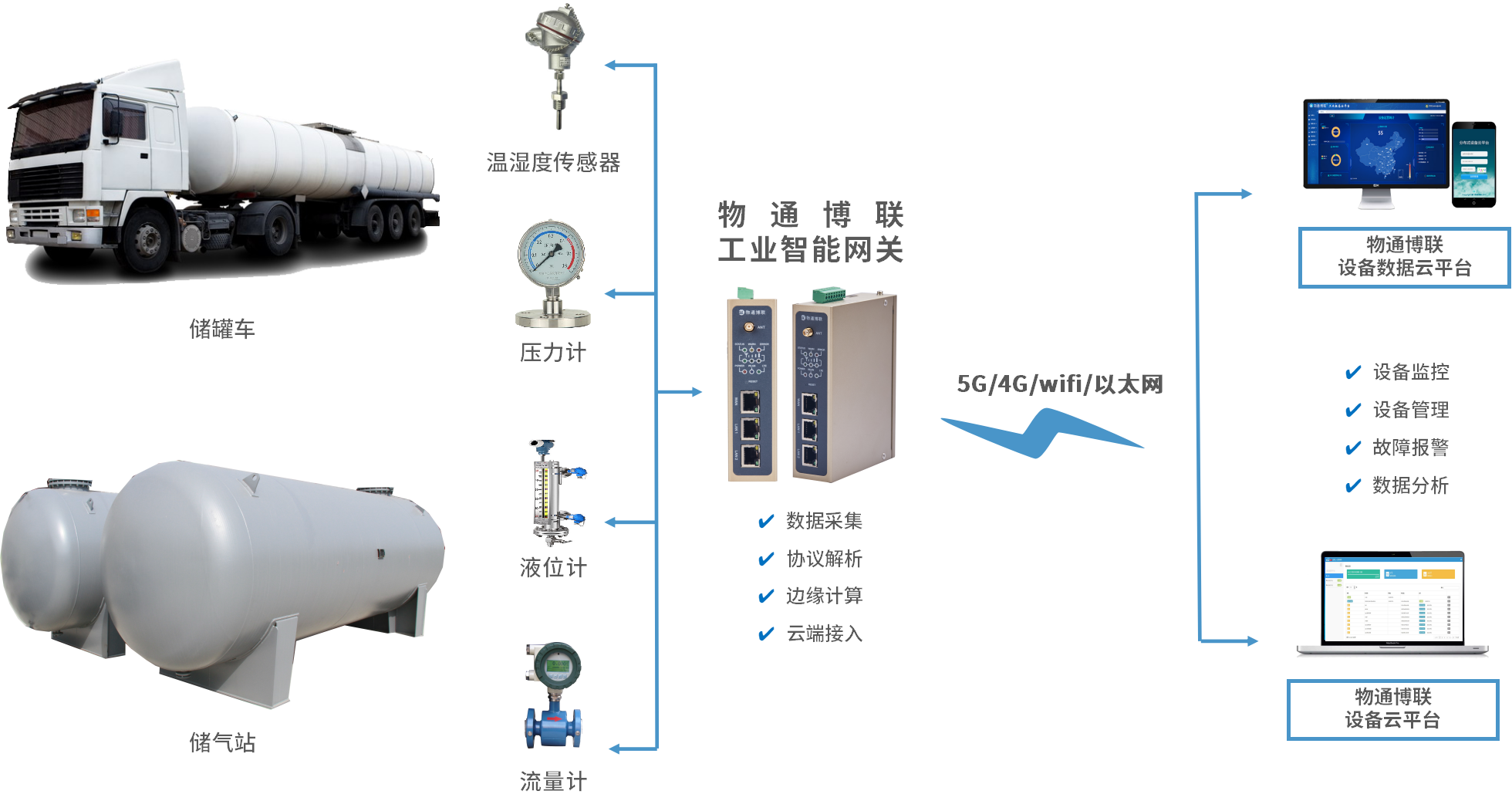 物通博聯(lián)工業(yè)網(wǎng)關(guān)采集溫度傳感器、壓力計、液位計、流量計等設(shè)備數(shù)據(jù)并以5G/4G/WIFI/以太網(wǎng)等方式上傳到設(shè)備遠(yuǎn)程運維管理平臺。通過云平臺實現(xiàn)對液位、壓力、溫度、流量等數(shù)據(jù)的在線監(jiān)測,并實現(xiàn)設(shè)備運行監(jiān)控、遠(yuǎn)程管理、故障報警等功能,進(jìn)而判斷燃?xì)廨斉湓O(shè)備的工作狀態(tài),保證燃?xì)廨斉湓O(shè)備的安全穩(wěn)定運行,有力支持燃?xì)廨斉涞陌踩芾砉ぷ鳌?/p>
