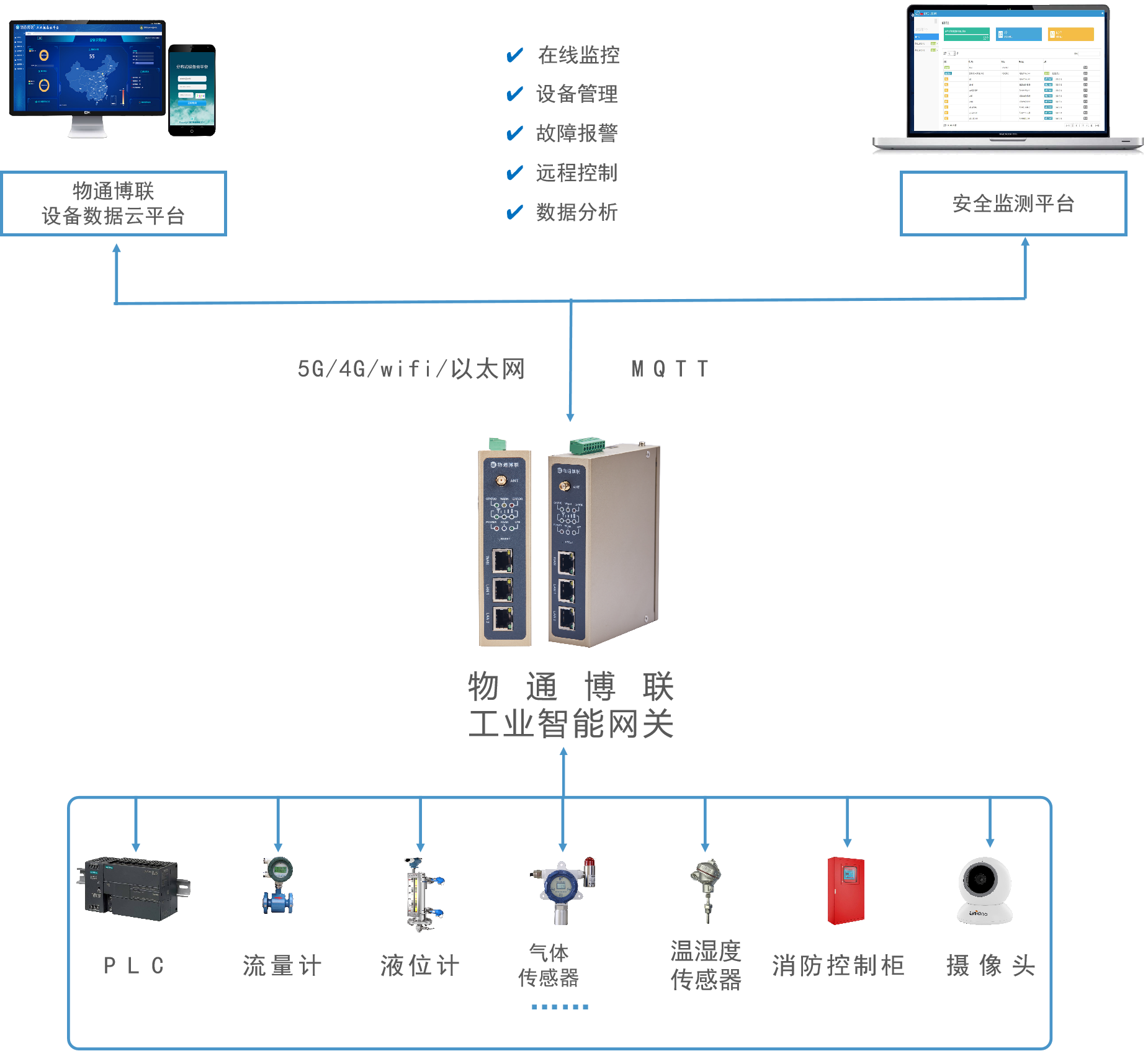 物通博聯(lián)工業(yè)智能網(wǎng)關(guān)支持接入液位計(jì)、流量計(jì)、溫濕度傳感器、氣體傳感器及消防控制柜PLC等設(shè)備,實(shí)時(shí)采集液位、流量、溫濕度、危險(xiǎn)氣體濃度及消防柜運(yùn)行狀態(tài)等數(shù)據(jù),并通過5G/4G/WIFI/以太網(wǎng)的方式對接到油庫儲(chǔ)量安全監(jiān)測平臺(tái)或國家監(jiān)管中心內(nèi),快速搭建分布式多站點(diǎn)的監(jiān)控網(wǎng)絡(luò),操作簡單、配置方便。