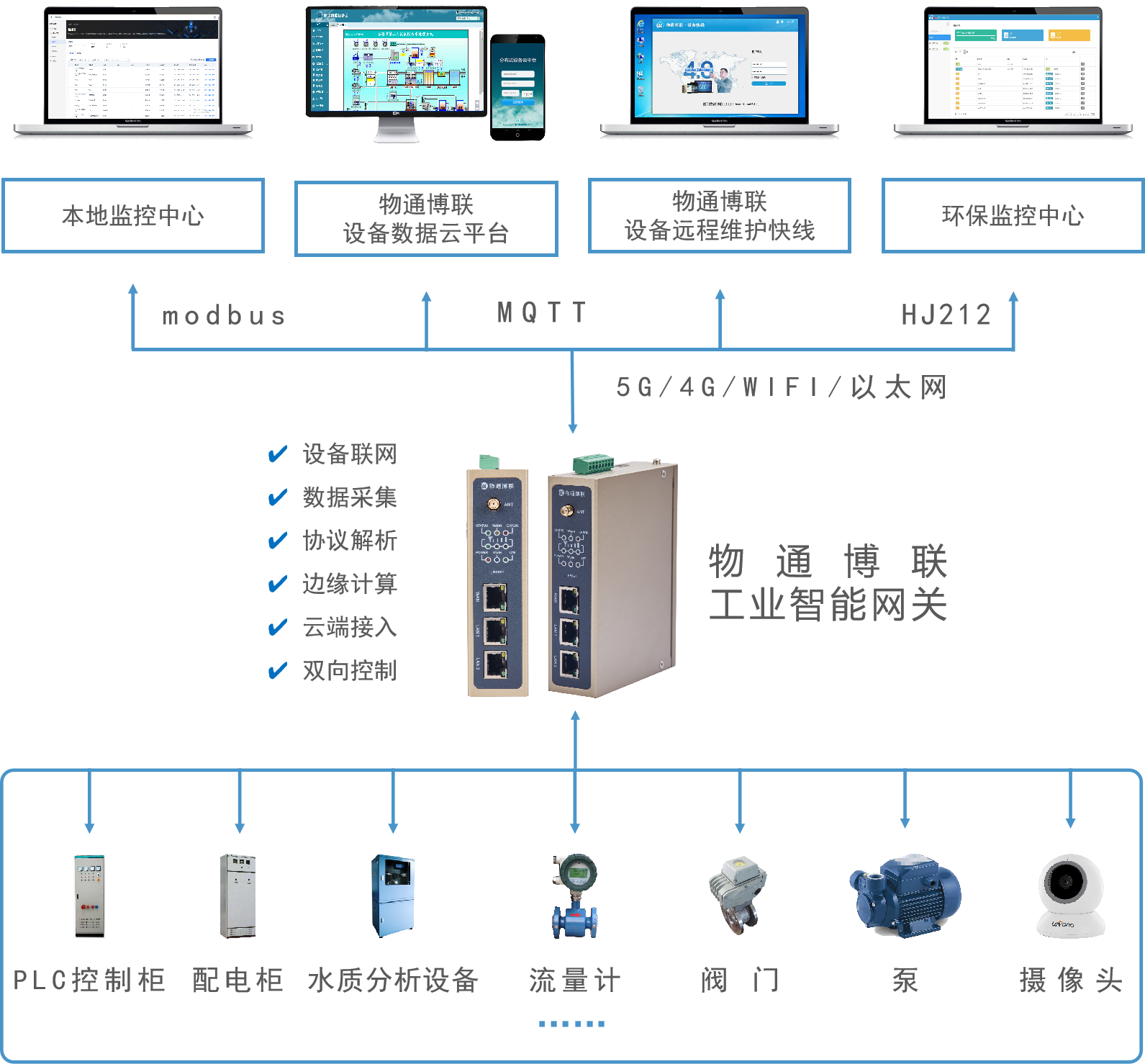 將工業(yè)智能網(wǎng)關(guān)接入到污水處理設(shè)備PLC、傳感器、水質(zhì)監(jiān)測儀等設(shè)備中,網(wǎng)關(guān)適配協(xié)議并進(jìn)行數(shù)據(jù)采集工作(如溫度、氨氮、重金屬濃度等水質(zhì)參數(shù)及電壓、電力等設(shè)備參數(shù)),采集到的數(shù)據(jù)將會以5G/4G/WIFI/以太網(wǎng)等方式上傳到本地監(jiān)控中心、遠(yuǎn)程監(jiān)控平臺及環(huán)保局平臺中(如HJ212、MQTT、Modbus等協(xié)議通信),快速實(shí)現(xiàn)污水處理設(shè)備物聯(lián)網(wǎng)通信系統(tǒng)的搭建。
