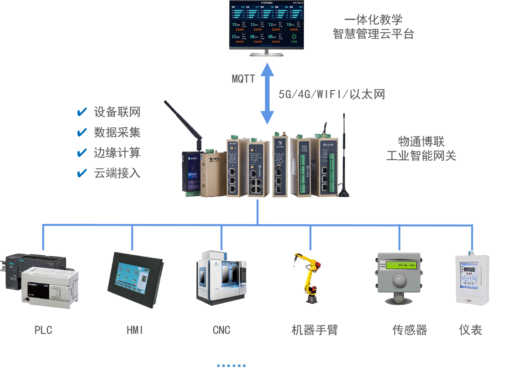 物通博聯(lián)WG系列工業(yè)智能網(wǎng)關(guān)是一款兩化融合和邊緣計(jì)算網(wǎng)關(guān),具有豐富的物理接口,如RS232、RS485、以太網(wǎng)口、IO接口等,與實(shí)訓(xùn)平臺的各種工業(yè)設(shè)備連接,解決接口不統(tǒng)一問題,內(nèi)嵌豐富的工控協(xié)議和智能采集算法,實(shí)時采集設(shè)備數(shù)據(jù),網(wǎng)關(guān)支持各種邊緣計(jì)算功能如智能采集、數(shù)據(jù)過濾、報(bào)警計(jì)算、跳變觸發(fā)、公式計(jì)算、分組策略、定時任務(wù)、算法開發(fā)等,通過對設(shè)備的模型建立和數(shù)據(jù)標(biāo)準(zhǔn)化后,將數(shù)據(jù)通過MQTT協(xié)議上傳到一體化教學(xué)智慧管理云平臺,幫助平臺實(shí)現(xiàn)各類工業(yè)設(shè)備數(shù)據(jù)的無縫接入、高效整合與精準(zhǔn)應(yīng)用,為提升實(shí)訓(xùn)效果提供了強(qiáng)有力的技術(shù)支撐。