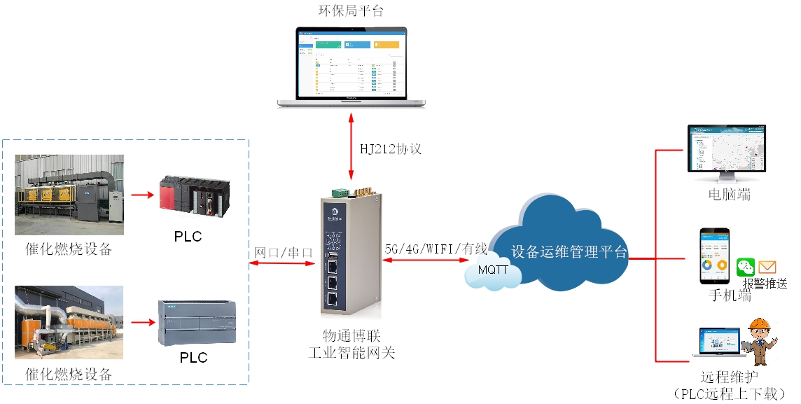 針對(duì)上述行業(yè)痛點(diǎn),物通博聯(lián)提供催化燃燒設(shè)備數(shù)據(jù)采集遠(yuǎn)程監(jiān)控系統(tǒng),實(shí)現(xiàn)設(shè)備的實(shí)時(shí)監(jiān)控與智能管理。通過(guò)將物通博聯(lián)工業(yè)智能網(wǎng)關(guān)接入催化燃燒設(shè)備控制柜PLC,實(shí)時(shí)采集設(shè)備數(shù)據(jù)并以5G/4G/WIFI/以太網(wǎng)等方式上傳到上位機(jī)或云平臺(tái)中,實(shí)現(xiàn)設(shè)備狀態(tài)和參數(shù)的實(shí)時(shí)監(jiān)控、異常告警、遠(yuǎn)程控制、數(shù)據(jù)分析等功能,為工廠廢氣治理提供可靠幫助。