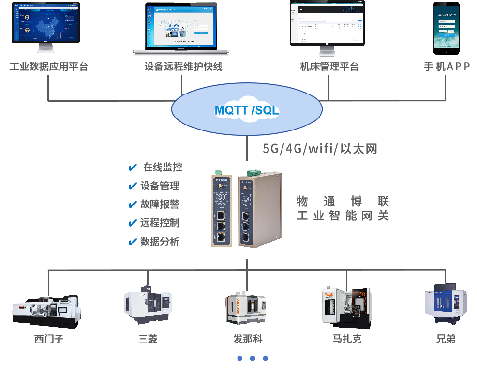 物通博聯(lián)推出的工業(yè)智能網(wǎng)關(guān)能夠接入西門子、三菱、馬扎克、發(fā)那科、海德漢、哈斯、兄弟、臺(tái)灣寶元、廣州數(shù)控等數(shù)控機(jī)床,實(shí)時(shí)采集設(shè)備數(shù)據(jù)、加工數(shù)據(jù)、刀具數(shù)據(jù)、生產(chǎn)數(shù)據(jù)等并對(duì)接到工廠MES系統(tǒng)、ERP系統(tǒng)中,從而實(shí)現(xiàn)手機(jī)端、電腦端、車間看板對(duì)各項(xiàng)數(shù)據(jù)的展示、告警、管理與分析,為生產(chǎn)、運(yùn)維、物料等相關(guān)工作開(kāi)展提供全面準(zhǔn)確的數(shù)據(jù)支持,助力企業(yè)制定科學(xué)合理決策,促進(jìn)高質(zhì)量發(fā)展。