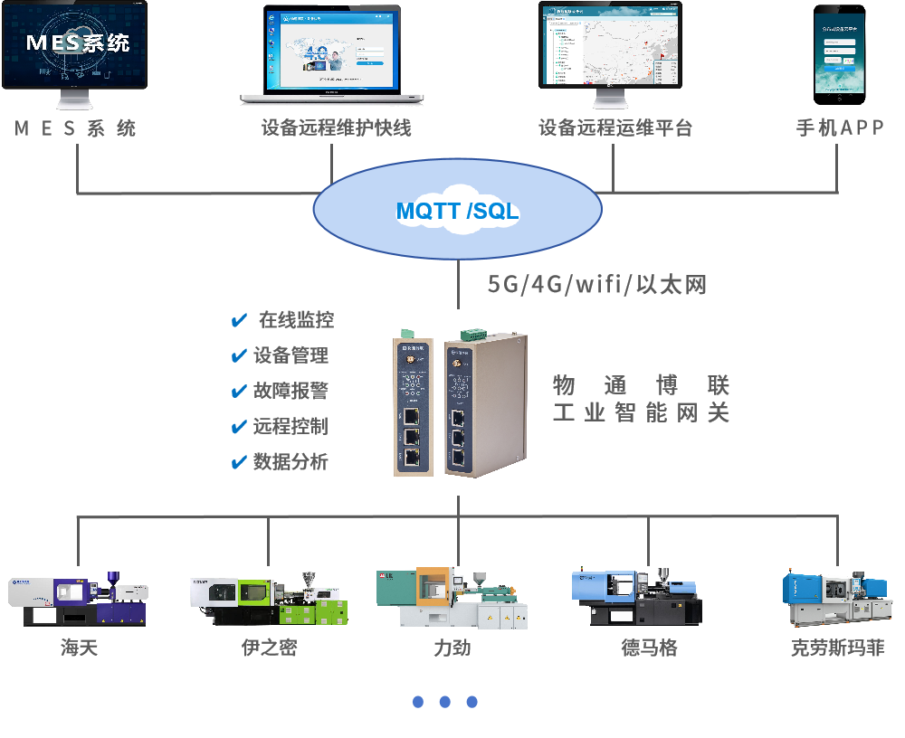 物通博聯(lián)推出的工業(yè)智能網(wǎng)關(guān)能夠接入弘訊、科強(qiáng)、恩格爾、住友、日精等注塑機(jī)控制器,從中采集注塑機(jī)運(yùn)行狀態(tài)、成型參數(shù)、工藝參數(shù)、報警信息等重要參數(shù),對接到工廠MES系統(tǒng)、ERP系統(tǒng)中,從而實現(xiàn)各項數(shù)據(jù)的統(tǒng)計展示與管理分析,輔助生產(chǎn)管理、工藝管理、運(yùn)維管理等工作高質(zhì)量開展,有助于提高工作效率與管理水平,企業(yè)效益持續(xù)增長。