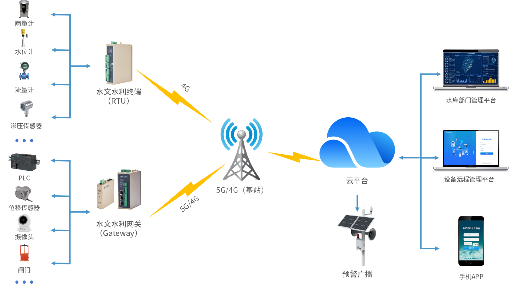 水位、降雨量、流量等數(shù)據(jù)的超過上下限,以及硬件設(shè)備的故障、電壓電流異常等情況自動報警,云平臺以發(fā)送短信、撥打電話、微信公眾消息、聲光報警器等多種形式示警。