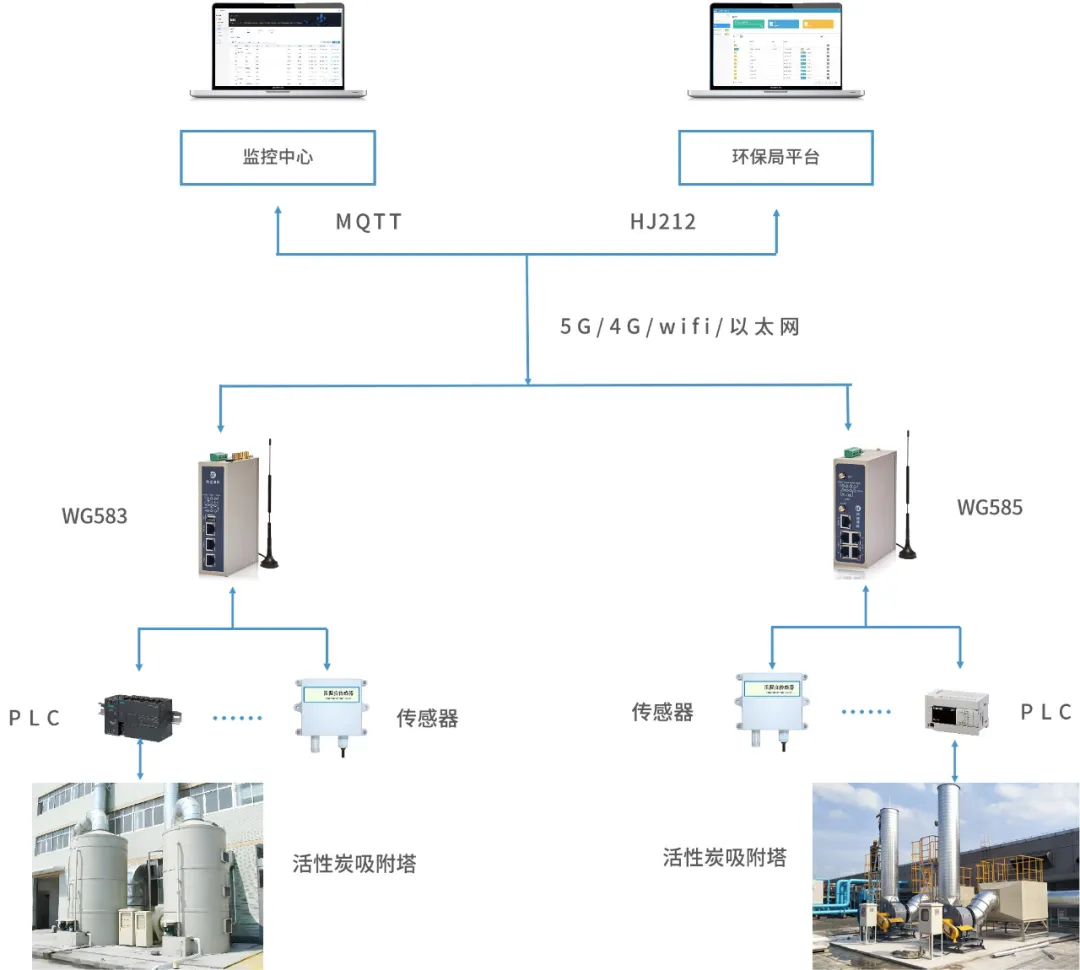 網(wǎng)關(guān)可以實時采集活性炭吸附塔PLC的各種運行參數(shù),并上傳到云平臺或上位機中,具備5G/4G/WIFI/以太網(wǎng)等通信和多種網(wǎng)絡(luò)防護能力。