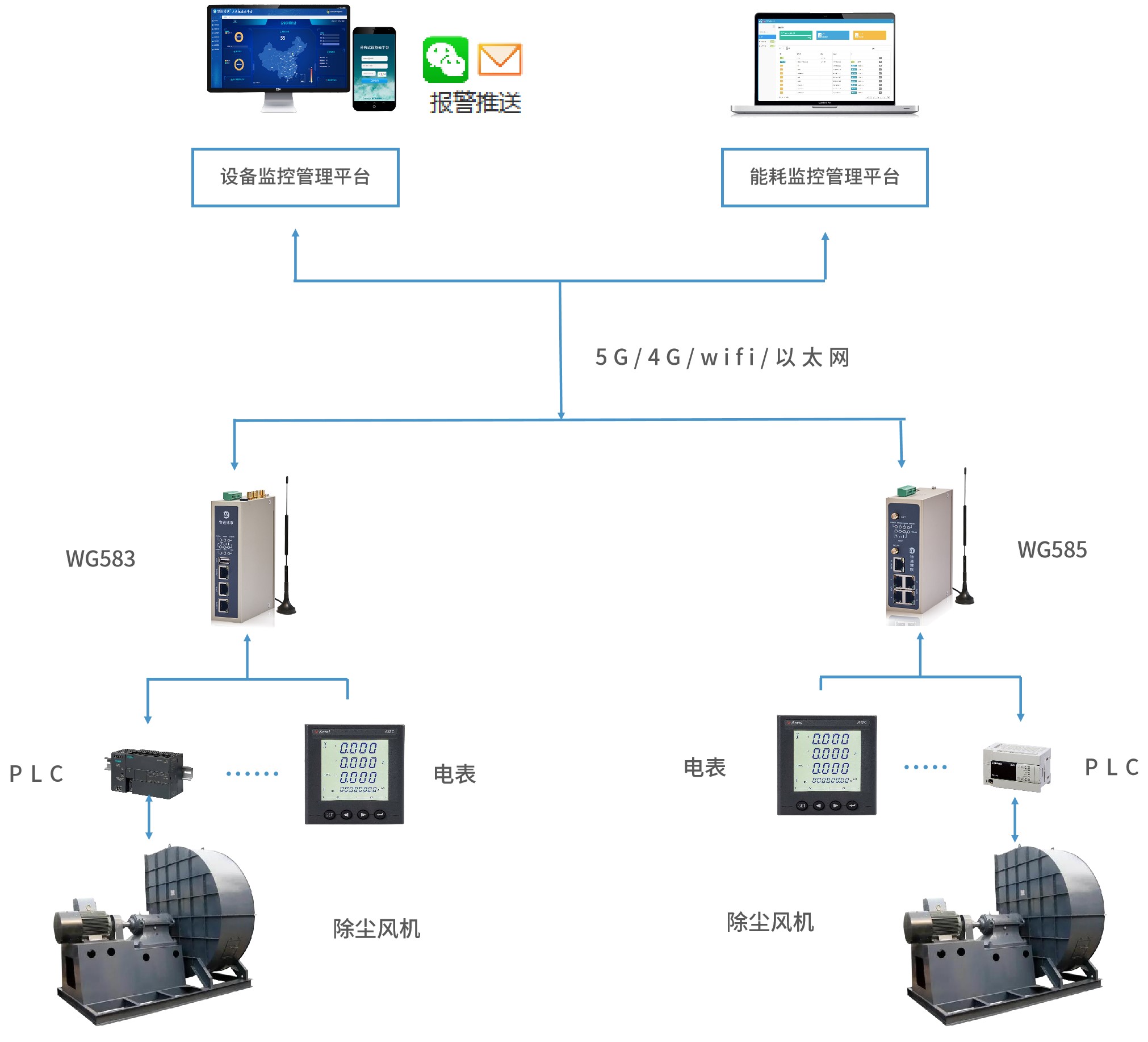 物通博聯(lián)工業(yè)智能網(wǎng)關(guān)具備多個(gè)串口/網(wǎng)口和協(xié)議解析能力,能夠接入除塵風(fēng)機(jī)PLC與智能電表等設(shè)備,實(shí)時(shí)采集設(shè)備數(shù)據(jù)并對接到本地上位機(jī)或云平臺中。
